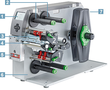 透過打印滾軸后方的導引裝置能使打印不偏移。使用旋鈕調整寬度時導引裝置會自動向中間靠攏。使用 A4+T 及 XD4T時額外安裝的馬達驅動滾軸能使打印完成的布質標簽平穩地和碳帶分離。