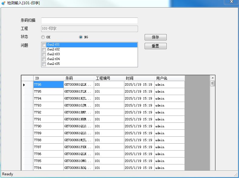 10:檢測(ce)輸入界面,問題可(ke)以在數據庫中(zhong)設置,此界面用于(yu) NG 條碼的輸入,問題選擇(ze)可(ke)以用于(yu)后續的匯
