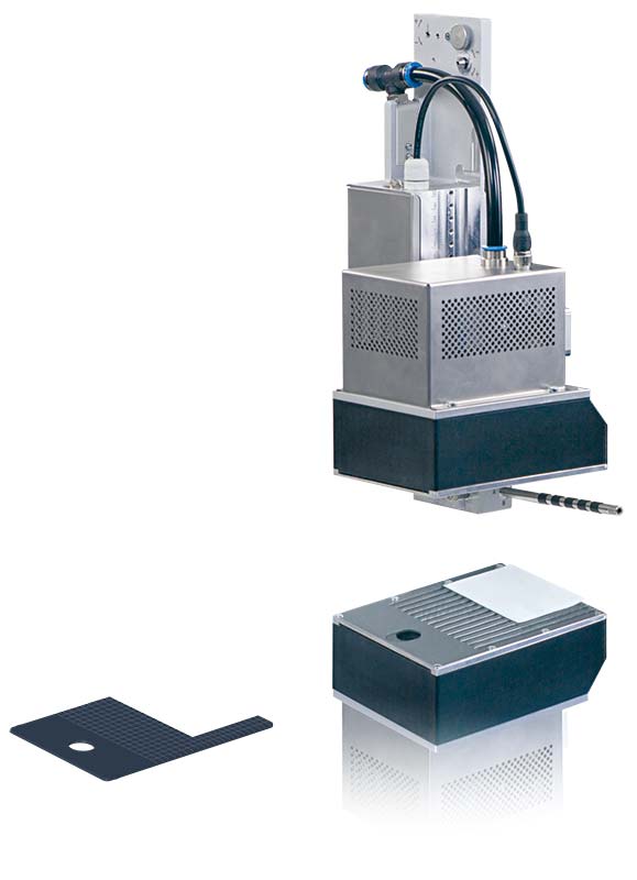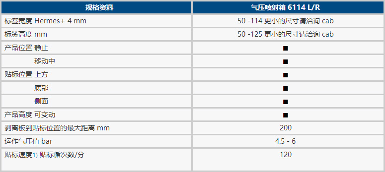 借由風扇吸取標簽并利用強力的噴射氣流經由調整過的噴嘴吹貼標簽。依據標簽尺寸,自產品到剝離板的距離最大為 200 mm。