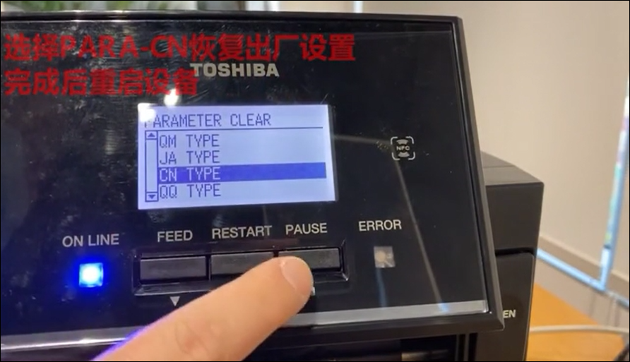 4.選擇 CN TYPE——按PAUSE鍵確認——等待出廠設置完成——重啟打印機。