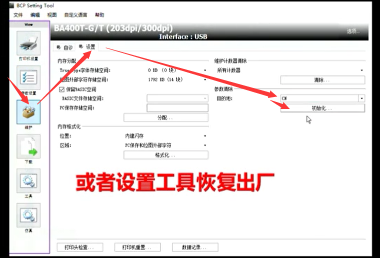 打開BCP Setting TOOL軟件——維護——設置——目的地選擇CN——點初始化——點確認——等待恢復出廠設置完成。